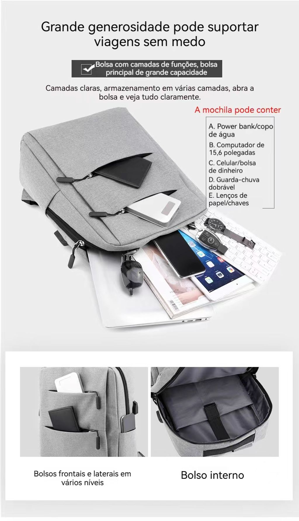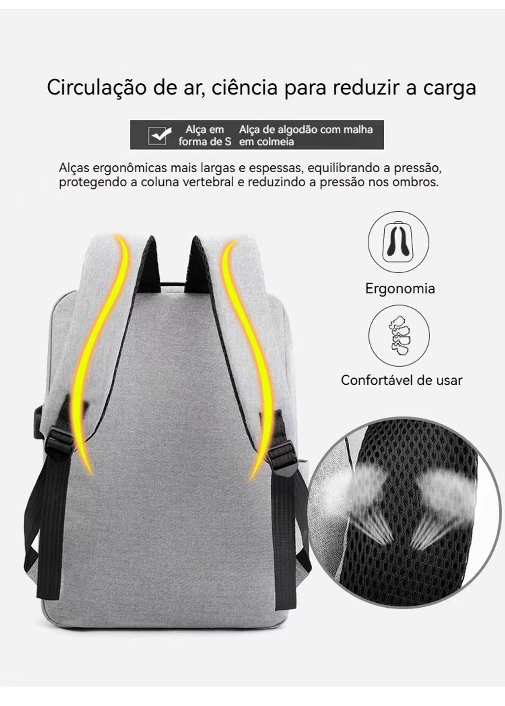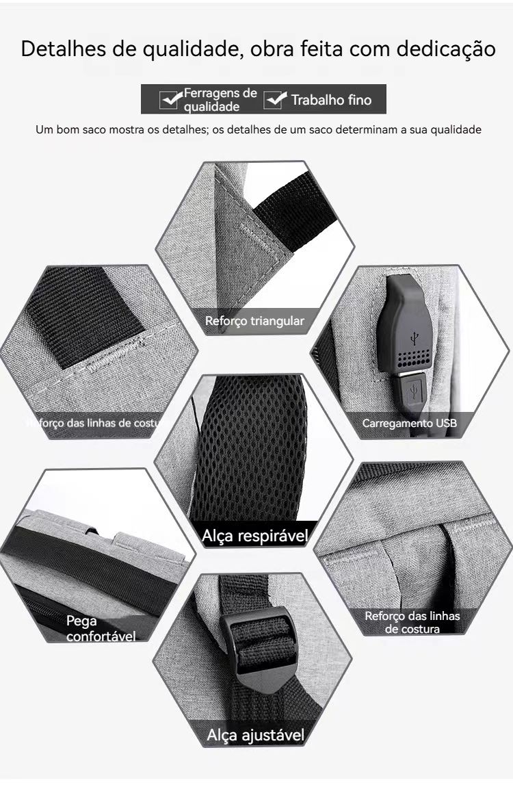 ✅ Carregador USB Integrado:Carrega o celular enquanto usa a mochila (prático para quem anda muito!).